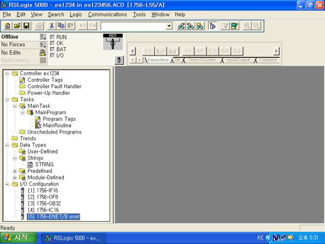 RSLogix5000 Ladder ÇÁ·Î±×·¥À» ½ÇÇàÇÏ¿© I/O ¼³Á¤À» ¿Ï·áÇϰí DownLoad, UpLoad µîÀÇ ÀÛ¾÷À» Çϰí PLC¿Í OnLine(¿¬°á)À» Çϸé <±×¸² 5>¿Í °°Àº ȸéÀÌ ³ªÅ¸³´Ù.